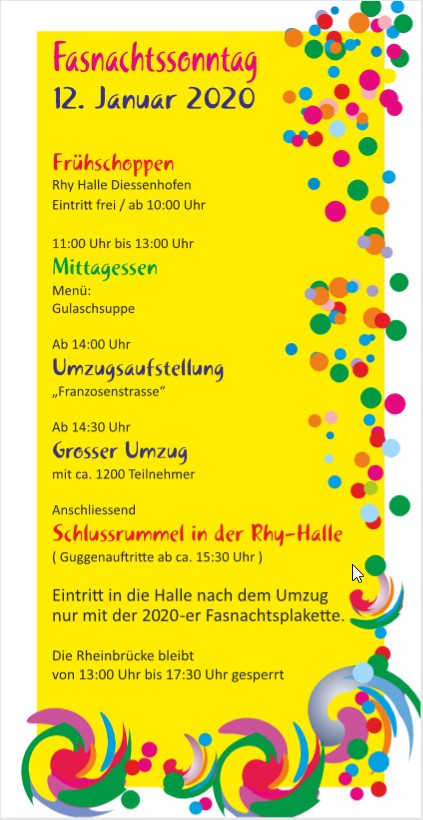 Bilderbogen vom Fasnachtsumzug 2019 in Weinfelden sowie vom anschliessenden Guggen-WarmUp 2019. Durch Anklicken des mittleren Pfeils in einem Bild kann eine automatische Diashow gestartet werden.